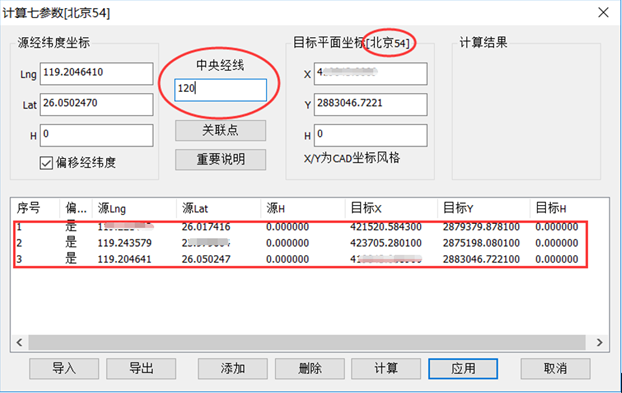 在開始計(jì)算7參數(shù)之前,請(qǐng)確認(rèn)你已獲知平面坐標(biāo)中的坐標(biāo)類型(北京54/西安80/國家2000),以及平面坐標(biāo)中所采用的中央經(jīng)線。