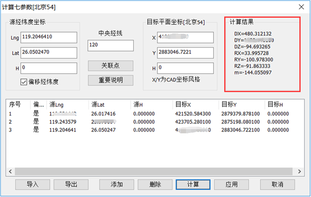 注意選擇正確的坐標(biāo)類型,添加至少3個(gè)關(guān)聯(lián)點(diǎn),就可以開始計(jì)算7參數(shù)。