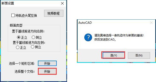 彈出[斷面設(shè)置]窗口,您可以對【將軌跡頭尾互換】【斷面類型】等進行設(shè)置,如下圖所示。本文以整個文檔為例,完成設(shè)置后,點擊【開始】按鈕,彈出提示“請到奧維選擇一條軌跡作為斷面的基線”,點擊【是】按鈕,系統(tǒng)自動跳轉(zhuǎn)至奧維界面。