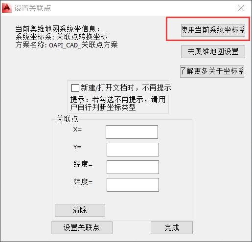 使用OmapCAD插件,首先要設(shè)置坐標(biāo)系。默認情況下,每次啟動AutoCAD,會自動彈出[設(shè)置關(guān)聯(lián)點]窗口,提示您設(shè)置坐標(biāo)系。