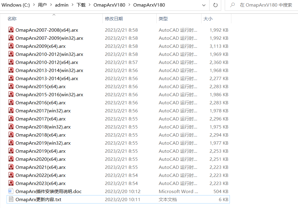 您下載好軟件壓縮包后,解壓,可以看到有2007至2023等版本的OmapCAD插件。