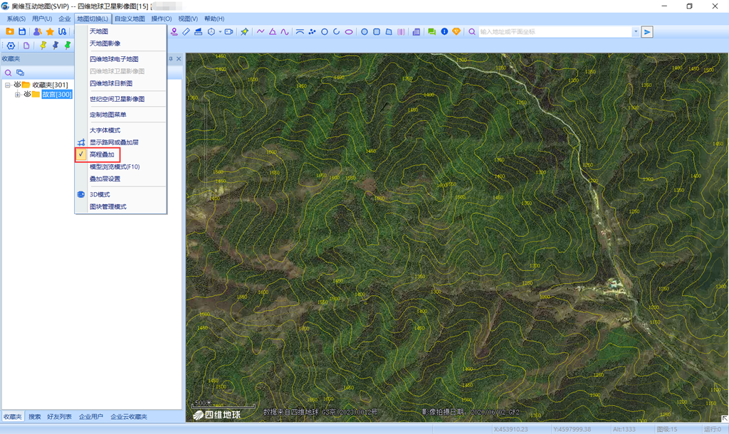 在奧維中,點擊[地圖切換],點擊【高程疊加】,縮放地圖,加載等高線。