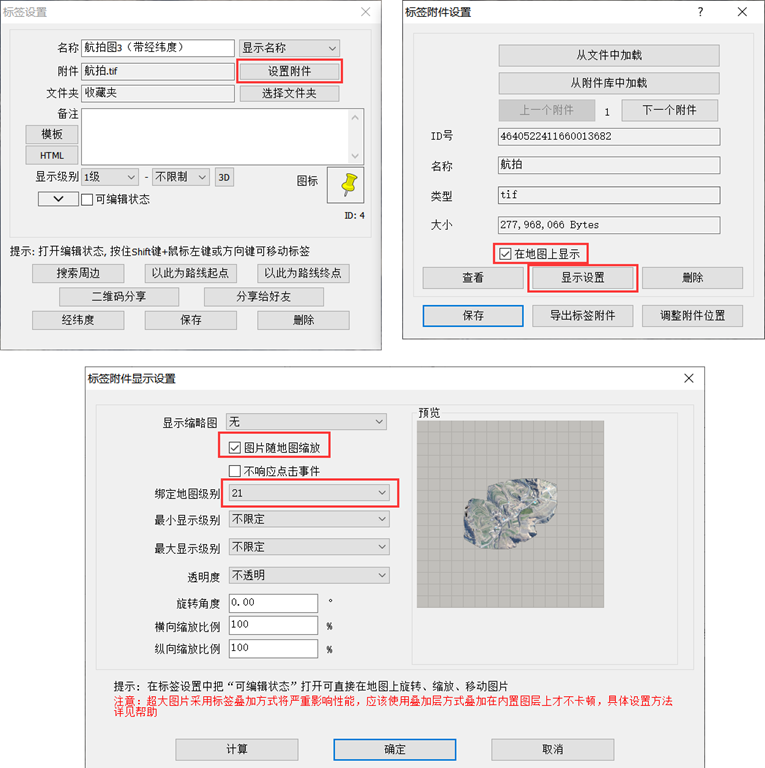 在地圖窗口中點擊該標簽,點擊image-20250513141150389按鈕,進入【標簽設置】窗口,點擊【設置附件】,進入【標簽附件設置】窗口,勾選【在地圖上顯示】,點擊【顯示設置】,進入【標簽附件顯示設置】窗口,勾選【圖片隨地圖】縮放,設置綁定地圖級別,點擊【確定】按鈕。