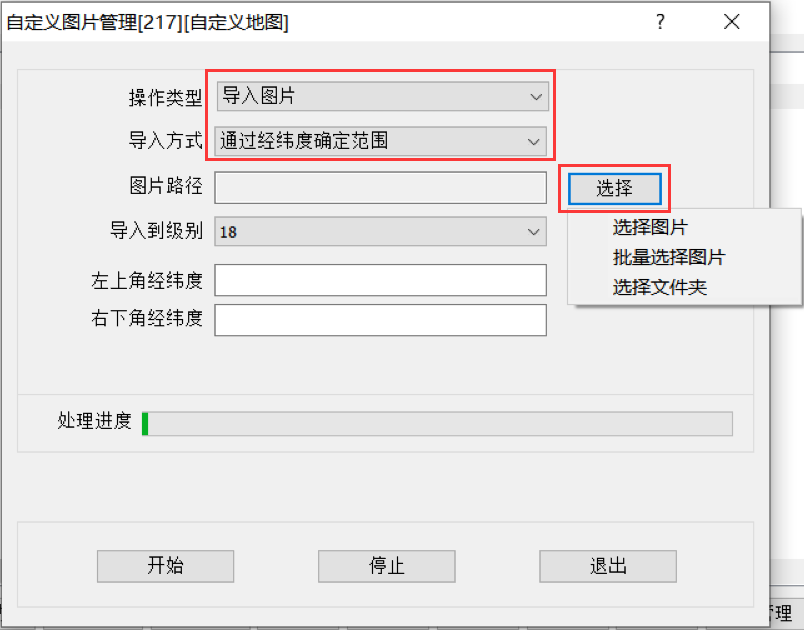 在[自定義地圖管理[217]]窗口中,點(diǎn)擊【操作類型】下拉框,選擇【導(dǎo)入圖片】,點(diǎn)擊【導(dǎo)入方式】下拉框,選擇【通過(guò)經(jīng)緯度確定范圍】,點(diǎn)擊【圖片路徑】欄右側(cè)的【選擇】按鈕。