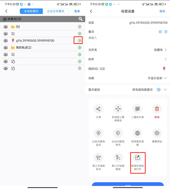在奧維中,在終點(diǎn)處添加標(biāo)記后,可以使用外部的導(dǎo)航程序(百度地圖、高德地圖等)打開進(jìn)行導(dǎo)航。
