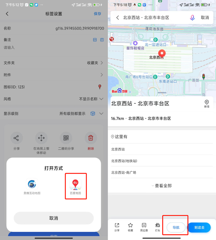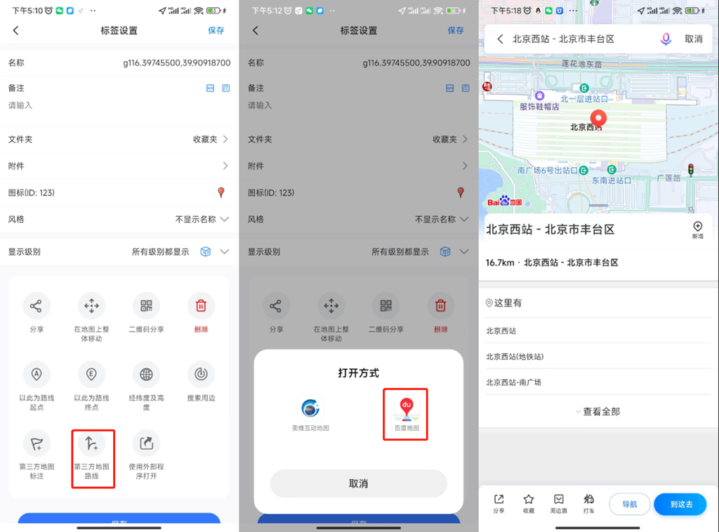 在【標(biāo)簽】設(shè)置頁面中,點(diǎn)擊【第三方地圖路線】,選擇外部程序(高德地圖、百度地圖等),如百度地圖,系統(tǒng)自動打開百度地圖,并規(guī)劃出用戶當(dāng)前位置到終點(diǎn)的線路,用戶可修改起點(diǎn)、交通方式、路線等,點(diǎn)擊【開始導(dǎo)航】按鈕,即可。