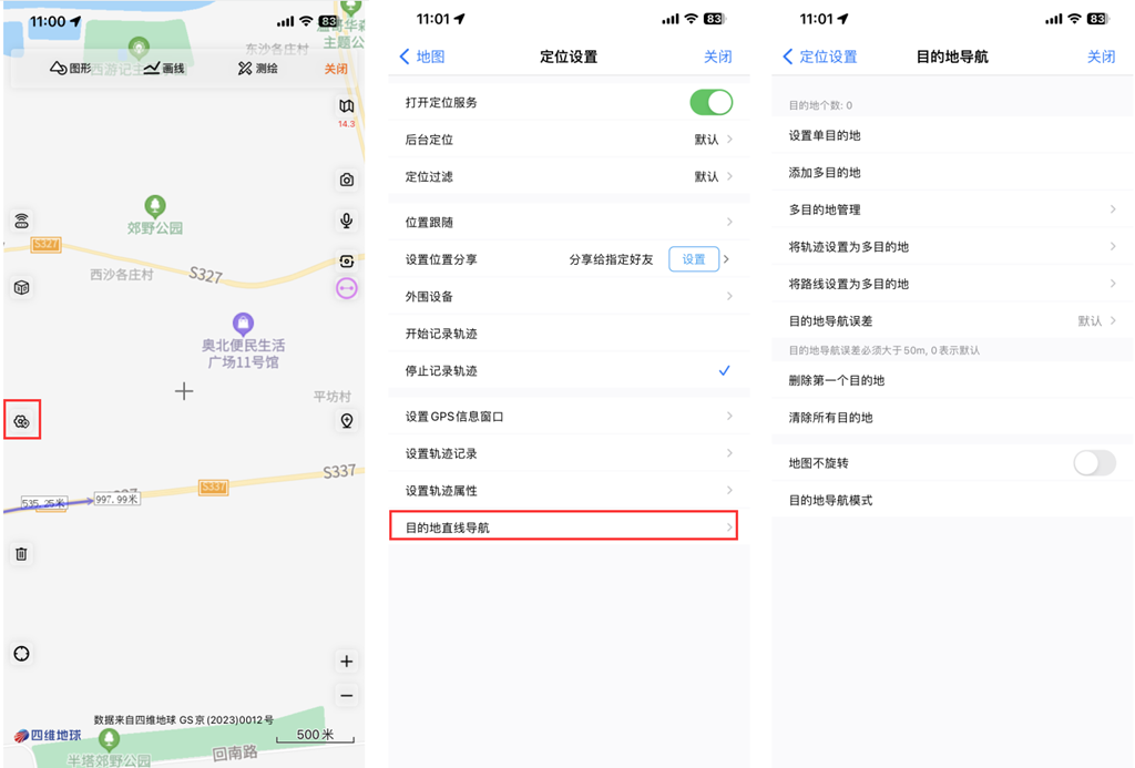 完成后,重新點(diǎn)擊1---按鈕,進(jìn)入【GPS設(shè)置】頁面,點(diǎn)擊【目的地直線導(dǎo)航】按鈕,進(jìn)入【目的地導(dǎo)航】頁面。