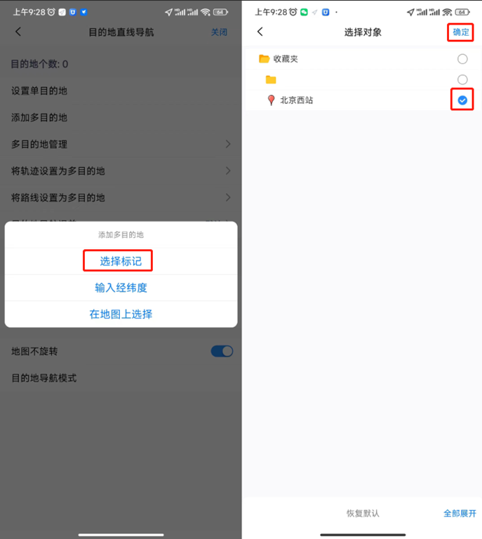 ①選擇標(biāo)記:點(diǎn)擊【添加多目的地】,點(diǎn)擊【選擇標(biāo)記】,選中需要作為目的地的標(biāo)記,點(diǎn)擊【確定】按鈕,即可將該標(biāo)簽添加為目的地。若要添加多個(gè),則重復(fù)執(zhí)行該操作。