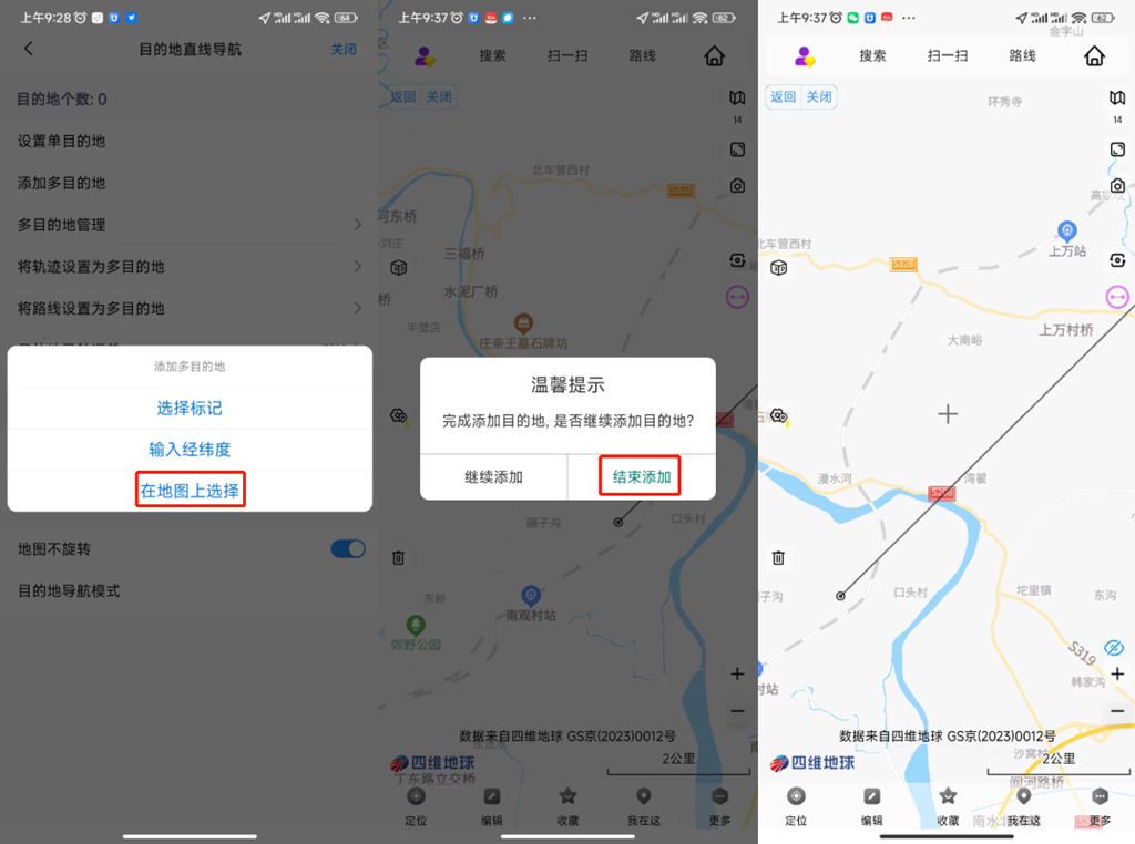 用戶可直接在地圖上選擇目的地。點(diǎn)擊【添加多目的地】按鈕,點(diǎn)擊【在地圖上選擇】按鈕,在地圖上目的地的位置點(diǎn)擊一下,即可添加一個(gè)目的地,同時(shí)彈出相關(guān)提示,點(diǎn)擊【確定】按鈕,繼續(xù)添加,點(diǎn)擊【結(jié)束添加】按鈕,結(jié)束添加。如下圖所示,圓點(diǎn)表示目的地,虛線表示導(dǎo)航的航線。