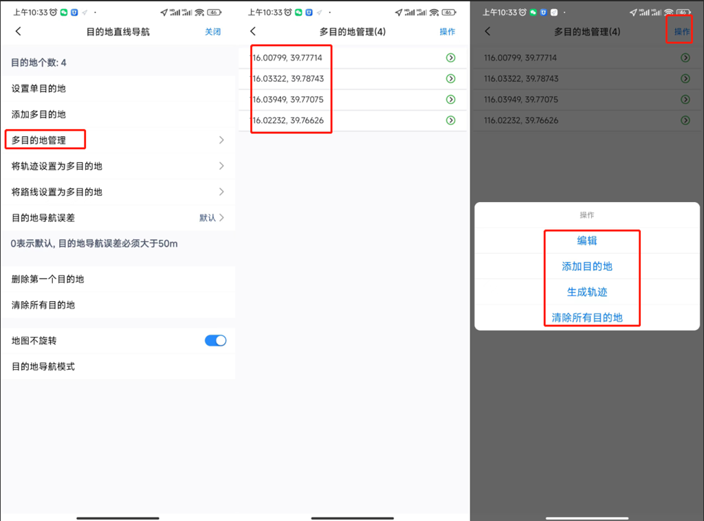 在【目的地導(dǎo)航】窗口中,點(diǎn)擊【多目的地管理】按鈕,進(jìn)入【多目的地管理】頁面,點(diǎn)擊【操作】按鈕,可編輯、添加、清除目的地。