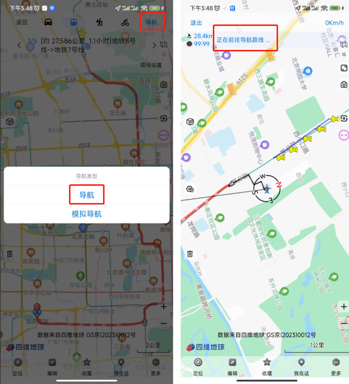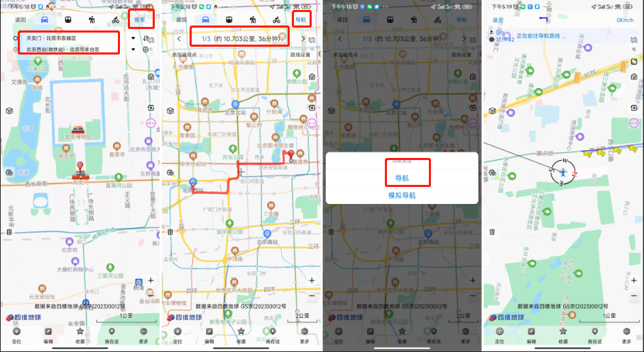 選擇完起點(diǎn)和終點(diǎn)后,點(diǎn)擊【搜索】按鈕,搜索路線;點(diǎn)擊【導(dǎo)航】按鈕,導(dǎo)航類型選擇導(dǎo)航,即可開始導(dǎo)航。