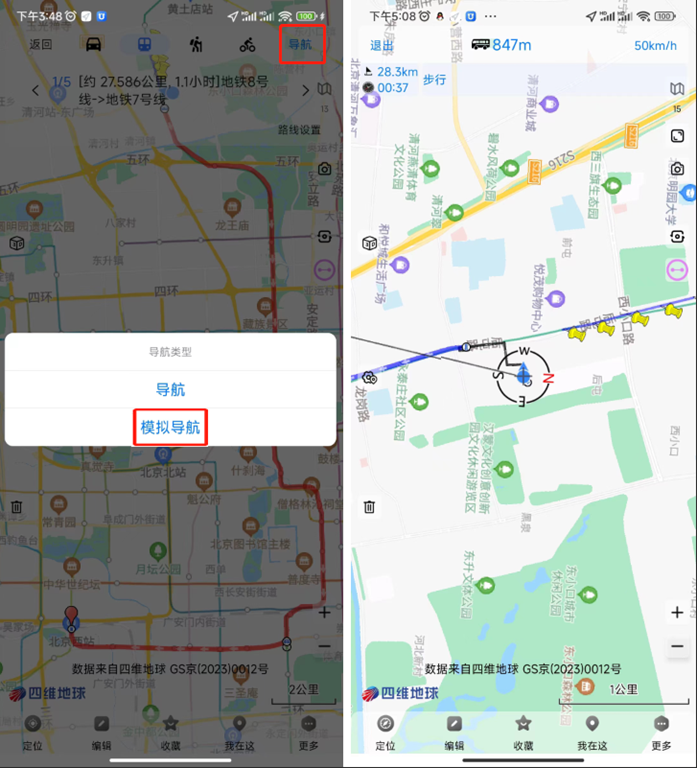 在導(dǎo)航之前,用戶可進(jìn)行模擬導(dǎo)航。點(diǎn)擊【導(dǎo)航】按鈕,點(diǎn)擊【模擬導(dǎo)航】,即可開始模擬導(dǎo)航,在模擬導(dǎo)航的過程中,會有相關(guān)語音提示。