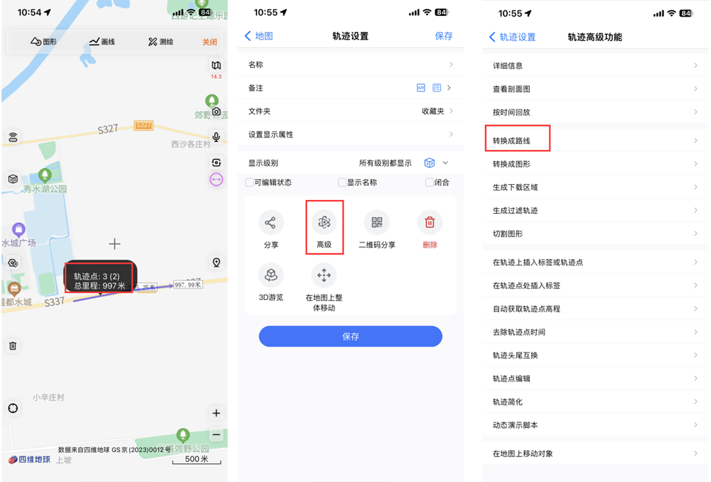 在地圖上,點(diǎn)擊軌跡,點(diǎn)擊下圖所示位置,進(jìn)入【軌跡設(shè)置】頁面,點(diǎn)擊【高級】,點(diǎn)擊【轉(zhuǎn)換成路線】按鈕,即以將軌跡轉(zhuǎn)換成了路線。