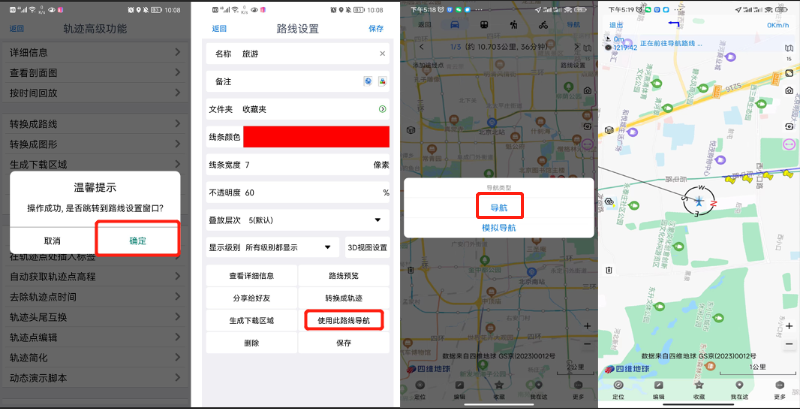 同時(shí)彈出提示“操作成功,是否跳轉(zhuǎn)到路線設(shè)置窗口”,點(diǎn)擊【確定】按鈕,進(jìn)入【路線設(shè)置】窗口,點(diǎn)擊【使用此路線導(dǎo)航】按鈕,彈出【導(dǎo)航類型】頁面,點(diǎn)擊【導(dǎo)航】,即開始導(dǎo)航。