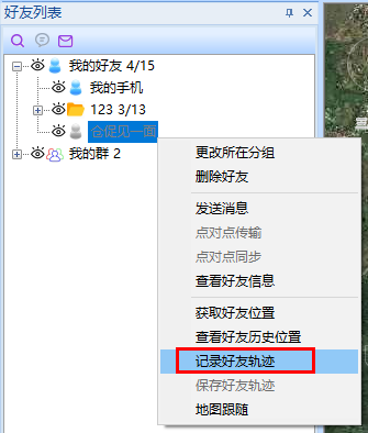 在[好友列表]窗口中,選中某一好友,點(diǎn)擊【右鍵】,點(diǎn)擊【記錄好友軌跡】按鈕,勾選狀態(tài),系統(tǒng)開始記錄好友軌跡,并顯示在地圖窗口中。
