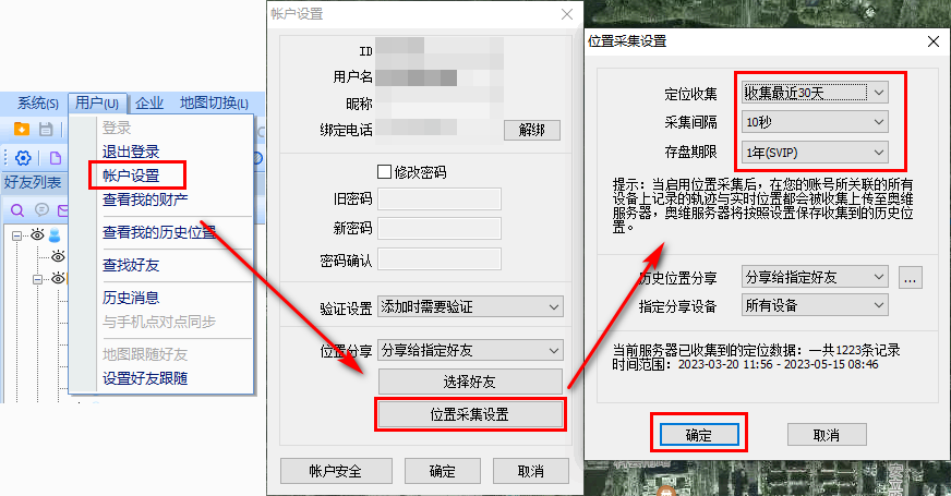 (3)存盤期限:用戶可根據(jù)實(shí)際需要設(shè)置,不同期限需要不同等級(jí)的VIP;若用戶設(shè)置為【無】,則收集的軌跡和實(shí)時(shí)位置不會(huì)存盤。