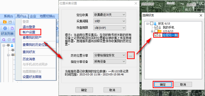 賬戶A操作,進(jìn)行顯示好友位置設(shè)置與顯示軌跡屬性設(shè)置。