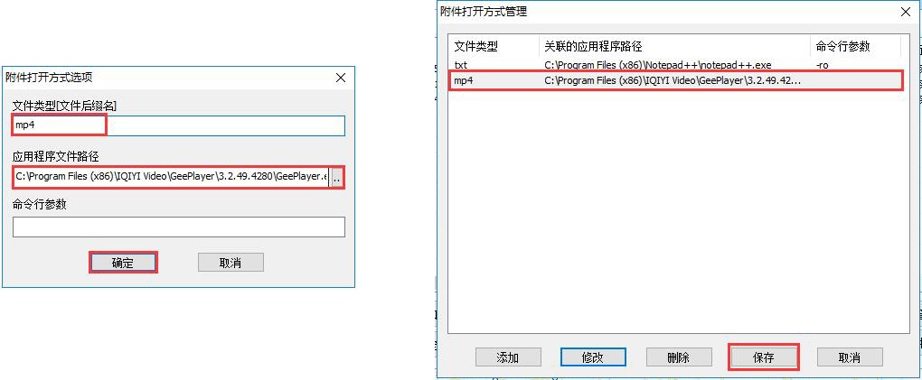 在[附件打開方式選項]窗口中,填寫文件后綴名,如mp4,填寫第三方應用程序文件路徑,本文使用愛奇藝萬能播放器打開(路徑:C:\Program Files (x86)\IQIYI Video\GeePlayer\3.2.49.4280\GeePlayer.exe),命令行參數(shù)可不填寫,點擊【確定】按鈕,點擊【保存】按鈕。