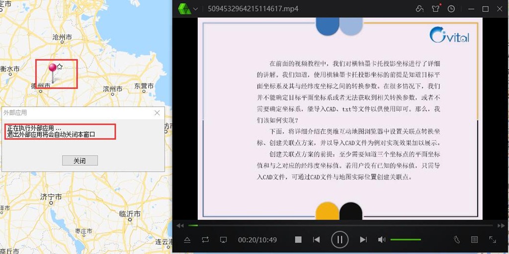 設置完成后,在地圖上,按住Ctrl鍵,點擊標簽,即可調(diào)用GeePlayer播放視頻文件。播放窗口后,會自動關(guān)閉[外部應用]窗口。