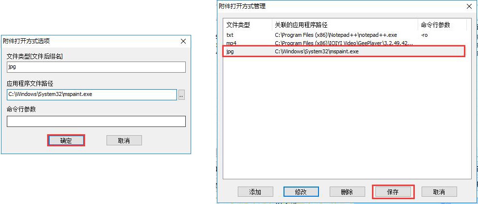 在[附件打開方式選項]窗口中,填寫文件后綴名,如JPG,填寫第三方應用程序文件路徑,本文使用Windows自帶的畫圖工具打開(路徑:C:\Windows\System32\mspaint.exe),命令行參數(shù)可不填寫,點擊【確定】按鈕,點擊【保存】按鈕。
