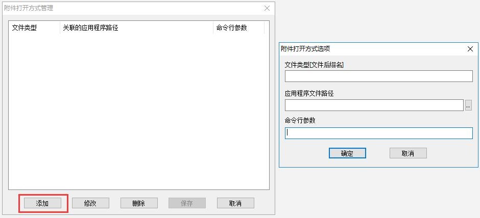 在[附件打開方式管理]窗口中,點擊【添加】按鈕,進入[附件打開方式選項]窗口,設置文件類型、應用程序文件路徑、命令行參數(shù);設置完成后,點擊【確定】按鈕,即可。
