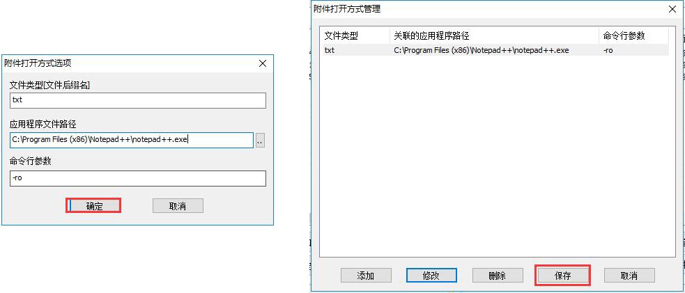 在[附件打開方式選項]窗口中,填寫文件后綴名.txt,填寫notepad++應用程序文件路徑C:\Program Files (x86)\Notepad++\notepad++.exe,填寫命令行參數(shù)(如-ro(只讀)),點擊【確定】按鈕,點擊【保存】按鈕。