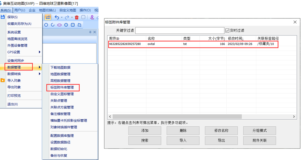 在奧維互動地圖中,點擊[系統(tǒng)]菜單,點擊【數(shù)據(jù)管理】,點擊【標簽附件庫管理】,進入[標簽附件庫管理]窗口,可在此查看添加到標簽里面的附件。