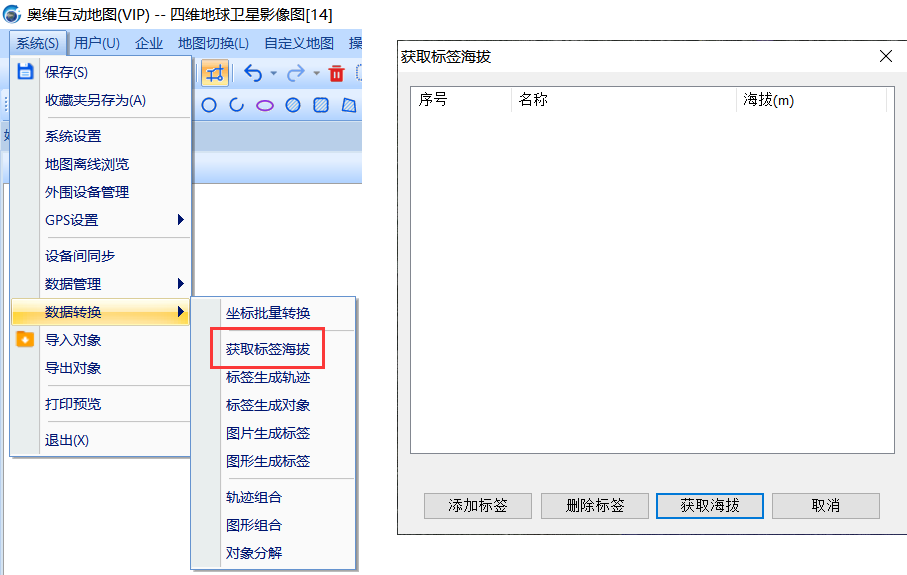 在奧維PC版主界面,點擊[系統(tǒng)]菜單,點擊【數(shù)據(jù)轉(zhuǎn)換】,點擊【獲取標簽】海拔,進入[獲取標簽海拔]窗口。