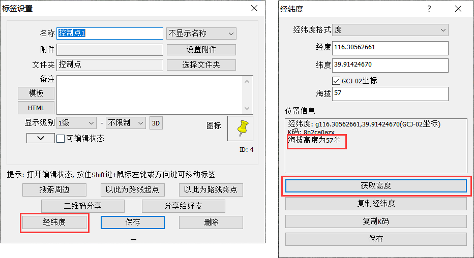 添加標簽后,點擊【獲取海拔】,點擊【確定】,即可獲取標簽的海拔信息。