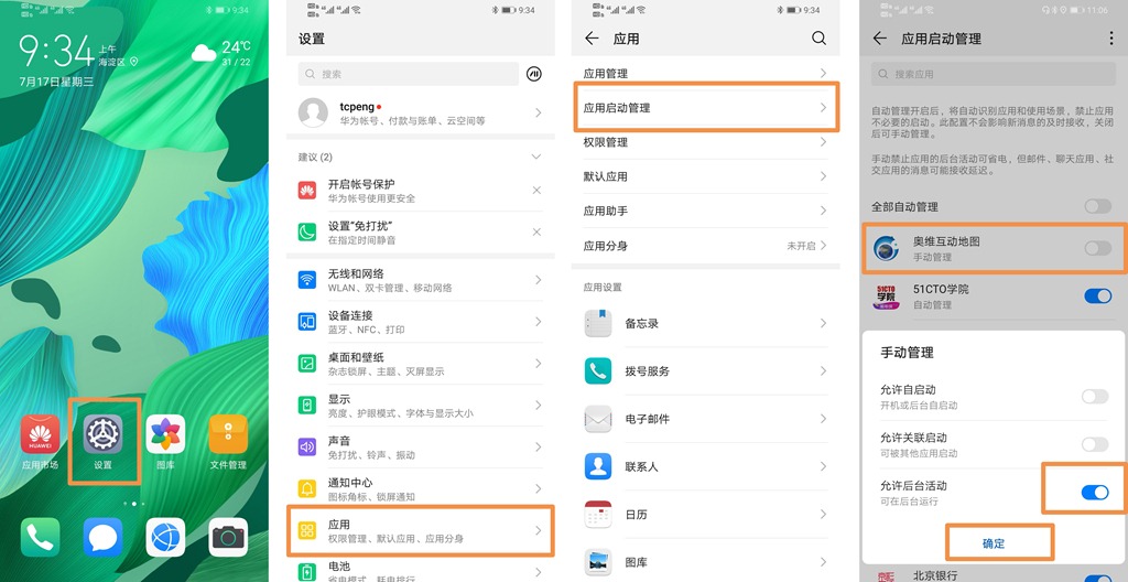 部分用戶在奧維安卓手機(jī)客戶端中啟用后臺(tái)定位,當(dāng)手機(jī)鎖屏?xí)r,后臺(tái)定位無法正常進(jìn)行,這是因?yàn)椴糠职沧渴謾C(jī)系統(tǒng)在黑屏待機(jī)后自動(dòng)清理后臺(tái)運(yùn)行軟件。為保證手機(jī)黑屏待機(jī)時(shí)正常進(jìn)行后臺(tái)定位,需要將奧維互動(dòng)地圖設(shè)置為后臺(tái)運(yùn)行應(yīng)用。下面以華為EMUI 9.1.1系統(tǒng)手機(jī)為例,詳細(xì)介紹設(shè)置步驟。