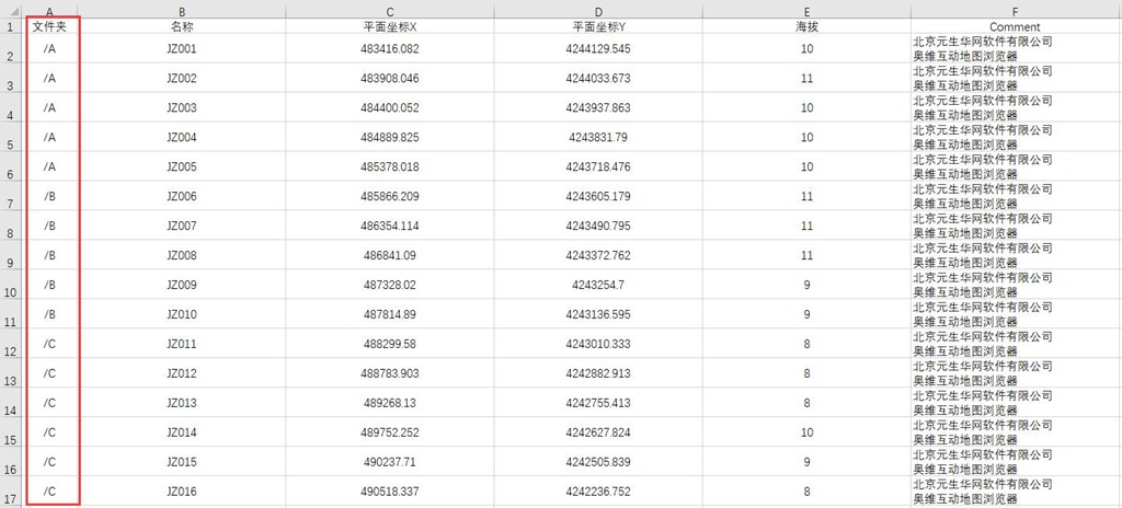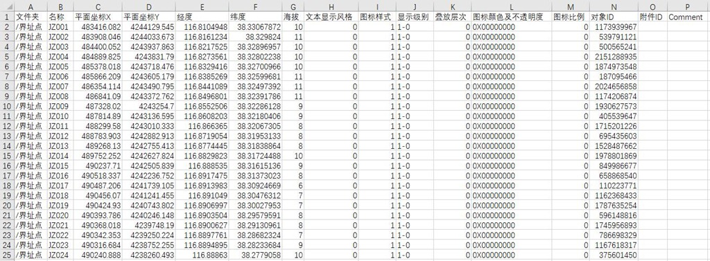 要將表格中的坐標(biāo)數(shù)據(jù)導(dǎo)入到奧維中來,其字段排列順序必須按照奧維規(guī)定的格式進(jìn)行設(shè)置。奧維CSV格式數(shù)據(jù)模板如下: