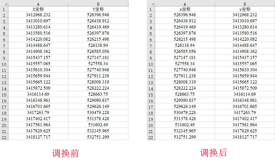 如下圖所示,這種情況就需要調(diào)換兩列坐標(biāo)值的順序。只需把坐標(biāo)值調(diào)換,表頭不需要調(diào)換。