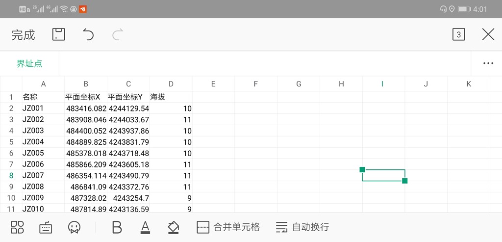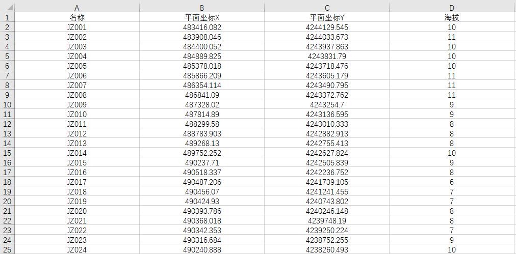 用戶在導(dǎo)入坐標(biāo)之前,應(yīng)參照上述模板對屬性字段進(jìn)行排序,沒有的字段不用排。如用戶的數(shù)據(jù)只有名稱、x坐標(biāo)、y坐標(biāo)、海拔這四個屬性,那么排列順序就為名稱、x坐標(biāo)、y坐標(biāo)、海拔。如下圖所示: