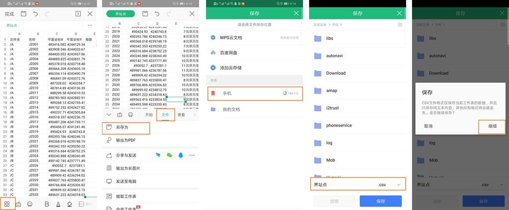 編輯完成后,另存為CSV文件,保存到手機(jī)存儲器中。如下圖所示: