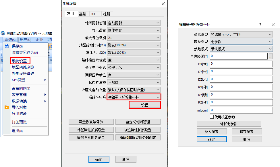 在奧維互動地圖PC版客戶端中,點擊[系統(tǒng)]菜單,點擊【系統(tǒng)設(shè)置】,進(jìn)入[系統(tǒng)設(shè)置]窗口;在[常用]選項卡中,點擊【系統(tǒng)坐標(biāo)系】下拉框,選擇【橫軸墨卡托投影坐標(biāo)】,點擊【設(shè)置】按鈕,進(jìn)入[橫軸墨卡托投影坐標(biāo)]設(shè)置窗口。用戶即可設(shè)置需要的坐標(biāo)系。