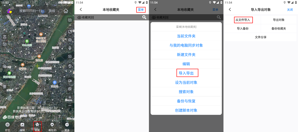 在奧維手機(jī)端,點擊【收藏】,點擊【菜單】,點擊【導(dǎo)入導(dǎo)出】,點擊【從文件導(dǎo)入】。