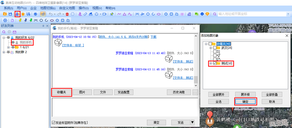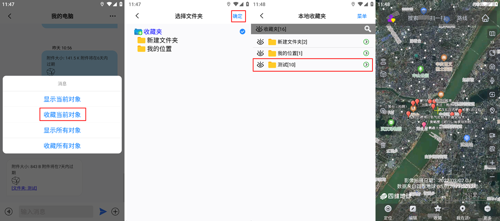 點擊數(shù)據(jù),點擊【收藏當(dāng)前對象】,選擇存放目錄,點擊【確定】,可將數(shù)據(jù)保存到手機(jī)端的收藏夾中,同時數(shù)據(jù)會顯示在地圖上。