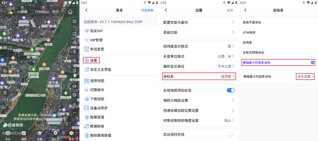 在奧維手機(jī)端主界面,點擊【更多】按鈕,進(jìn)入點擊【設(shè)置】按鈕,點擊【坐標(biāo)系】,進(jìn)入[坐標(biāo)系]頁面,用戶可在此設(shè)置系統(tǒng)坐標(biāo)系。