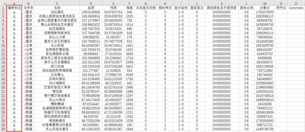 若數(shù)據(jù)的經(jīng)緯度坐標(biāo)為GCJ -02坐標(biāo)(GCJ -02經(jīng)緯度)或者BD -09坐標(biāo)(百度坐標(biāo)),則需要在表格的第一列加上偏移標(biāo)志,GCJ -02坐標(biāo)為“g”,BD -09坐標(biāo)為“b”。
