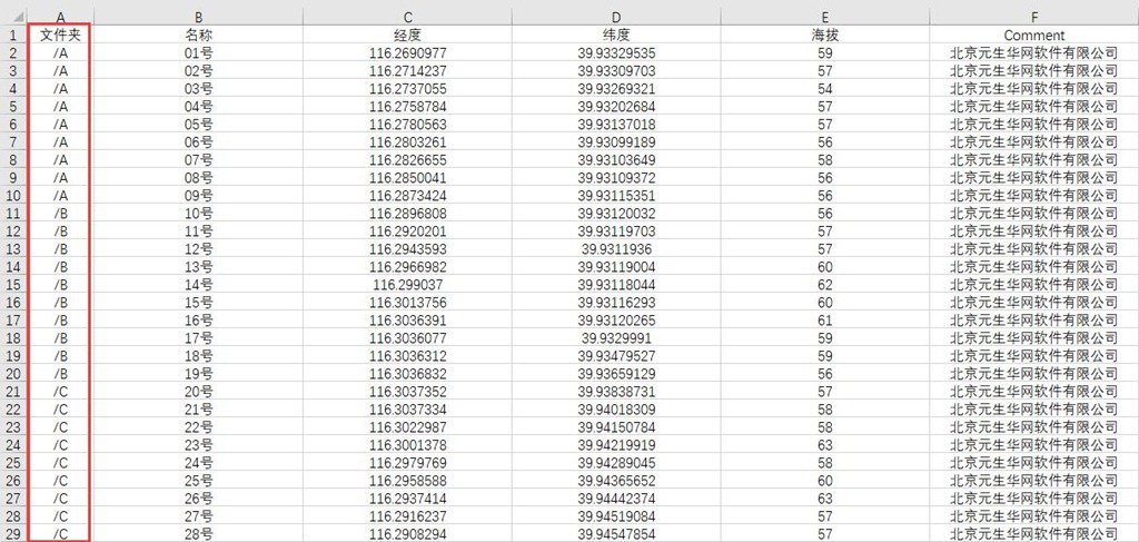要將表格中的坐標(biāo)數(shù)據(jù)導(dǎo)入到奧維中來,其字段排列順序必須按照奧維規(guī)定的格式進(jìn)行設(shè)置。奧維CSV格式數(shù)據(jù)模板如下: