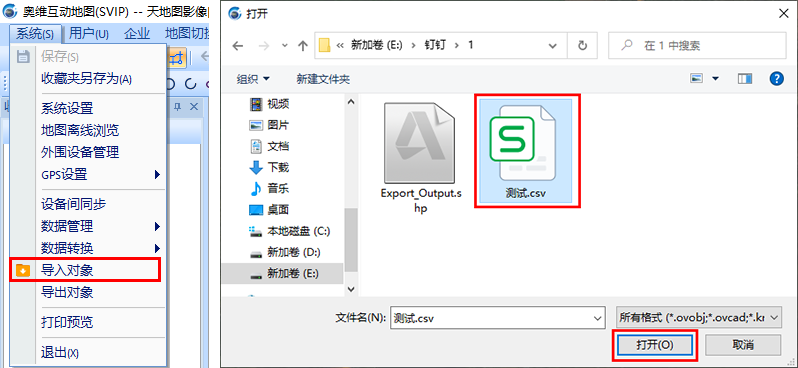 在奧維中點擊[系統(tǒng)]菜單,點擊【導(dǎo)入對象】,選擇需要導(dǎo)入的文件,點擊【打開】。