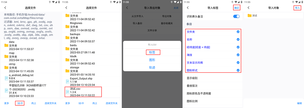 系統(tǒng)自動打開奧維根目錄,選擇CSV文件。如果用戶沒有將CSV保存在奧維根目錄下面,那么就點擊SD卡,找到保存CSV文件的目錄。