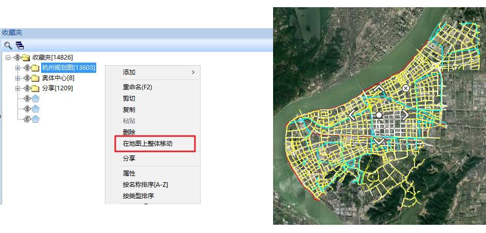 在收藏夾中選中所有數(shù)據(jù)(也可以選擇文件夾),點(diǎn)擊鼠標(biāo)右鍵,點(diǎn)擊【在地圖上整體移動】,在地圖上會出現(xiàn)“上下左右”方向按鈕。