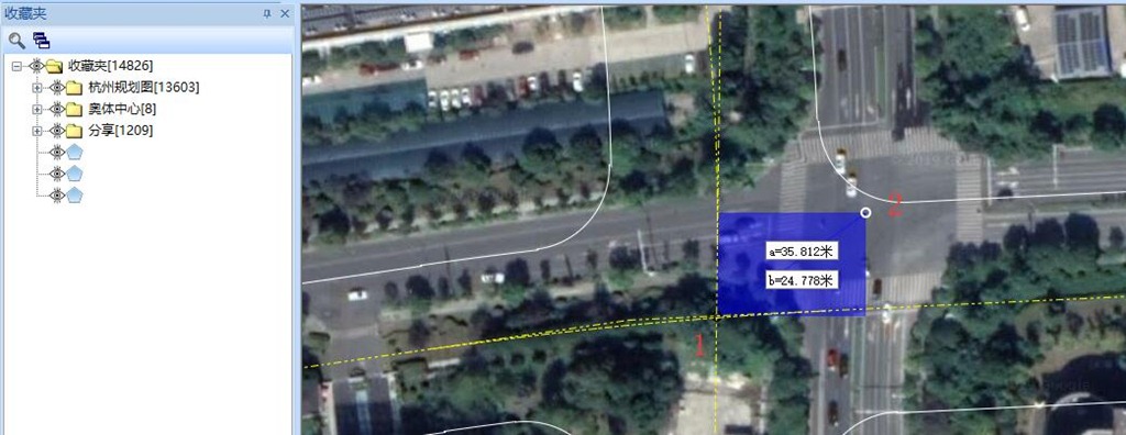 如下圖所示,標(biāo)識“1”的位置應(yīng)為道路交叉中心,即實(shí)際位置大致為標(biāo)識“2”所處的位置。通過矩形,可以看到這些數(shù)據(jù)整體向西偏移了35.812米(a),向南偏移了24.778米(b)。