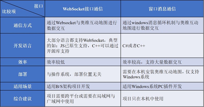 奧維互動(dòng)地圖支持第三方開(kāi)發(fā)接口,允許用戶(hù)在開(kāi)發(fā)第三方應(yīng)用的時(shí)候,通過(guò)奧維提供的開(kāi)發(fā)接口來(lái)訪(fǎng)問(wèn)和操作奧維互動(dòng)地圖內(nèi)部的數(shù)據(jù)。第三方接口有兩種通信方式:WebSocket和Windows窗口消息通信。這兩種通信方式各有優(yōu)缺點(diǎn),適合不同的場(chǎng)景。