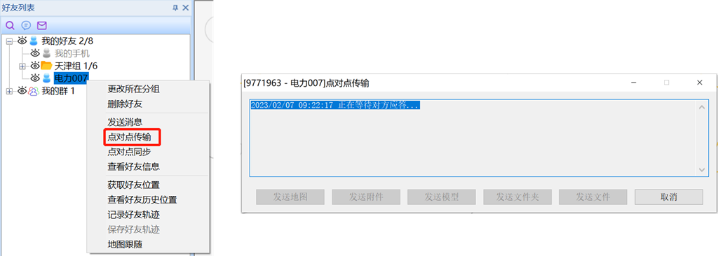 發(fā)送者在電腦端[好友列表]中找到【我的手機】(或者對應(yīng)的好友),鼠標右鍵,選擇【點對點傳輸】。地圖界面會彈出[點對點傳輸]界面。