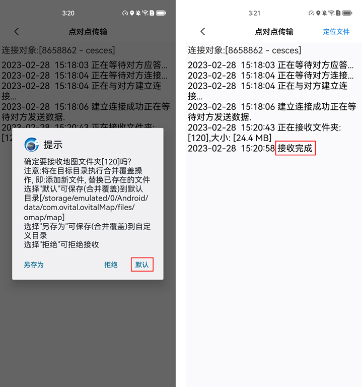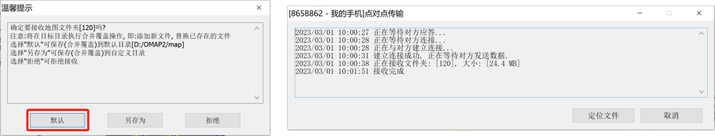 在手機端(或好友的奧維),彈出提示“是否接收地圖文件”,選擇【默認】,等待窗口提示“接收完成”。