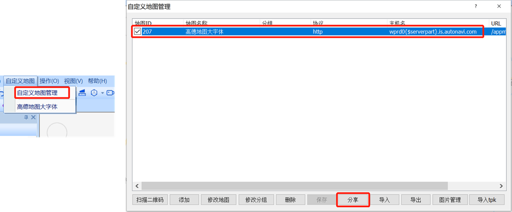 點擊[自定義地圖]→【自定義地圖管理】,勾選需要分享的圖層,點擊【分享】。