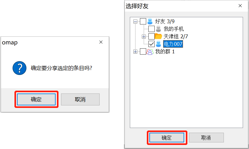 點擊【確定】,勾選“我的手機”或者某好友,點擊【確定】。