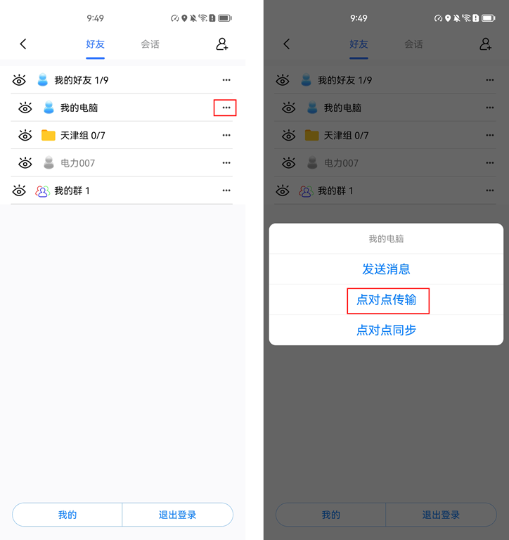 雙方均登錄奧維賬戶后,發(fā)送者在奧維手機端[好友列表]中找到【我的電腦】(或?qū)?yīng)的好友),點擊右側(cè)的image按鈕,選擇【點對點傳輸】。